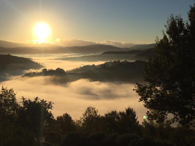 Dopo 20 chilometri di passi collinari, scorgo la curva con il muro di pietra sulla sinistra come le istruzioni fornite da Alec suggerivano. Rallento, svolto a destra e prendo una strada sterrata. Da questo momento in poi è solo vegetazione, casali di campagna e viste mozzafiato sopra valli fino agli appennini che si presentano inaspettate ad ogni curva. Una serie di segnali nel terreno mostra la via per Bellaugello.