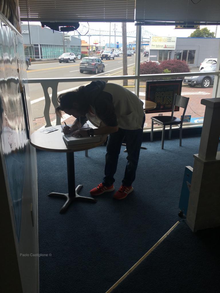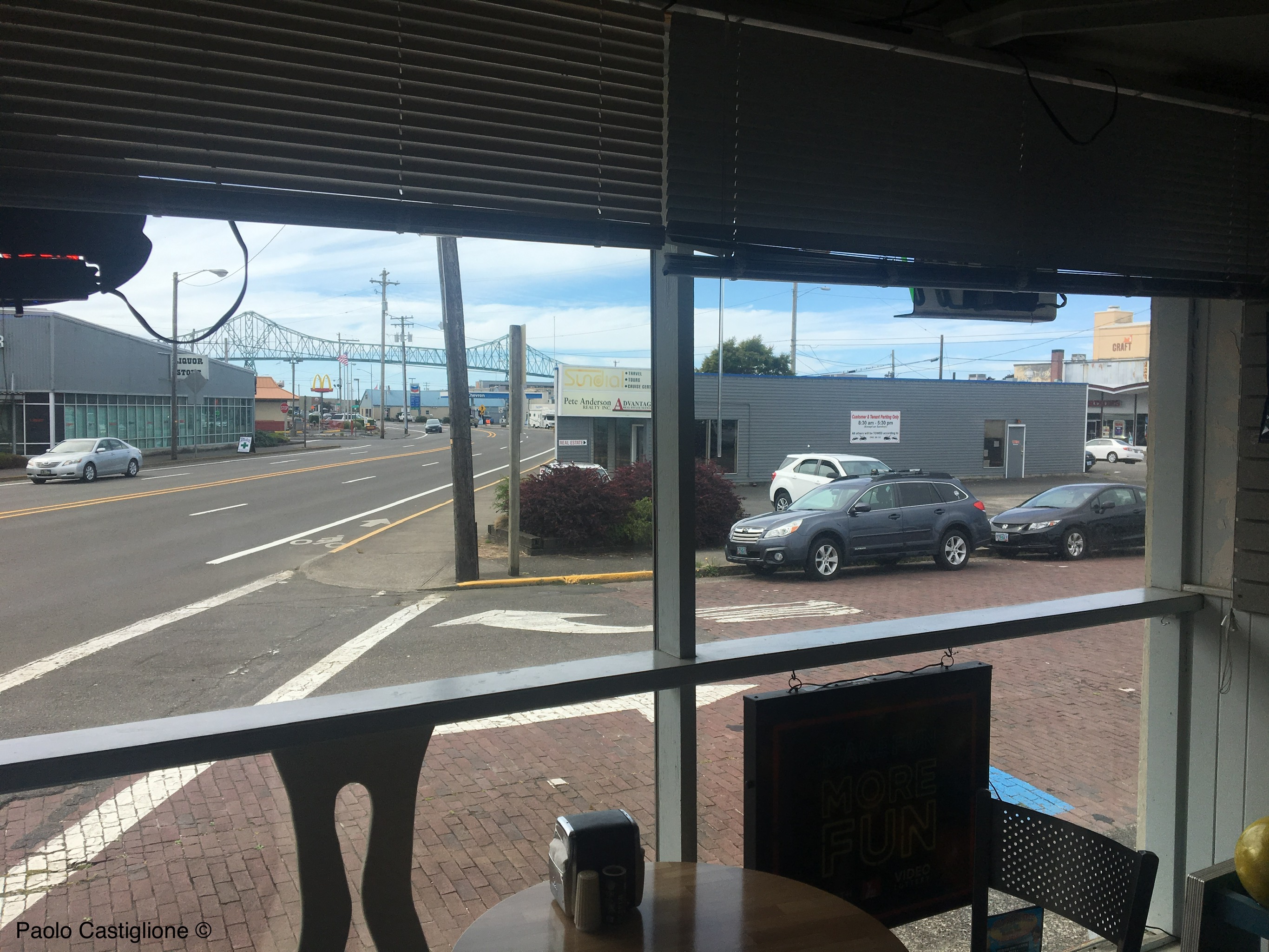 green hills. On my right, the Astoria-Megler Bridge – an extension of the Pacific Highway 101 that I’m following on my road trip down to California, moves a stream of cars across the state border. I know that bridge. I’ve never seen it before, nor have I ever been to this part of the country; yet, I could spot that bridge all the times I watched Troy’s father going to Walsh’s residence to deliver their eviction notice. The man stands outside the front gate; the Astoria-Megler well visible in the background.